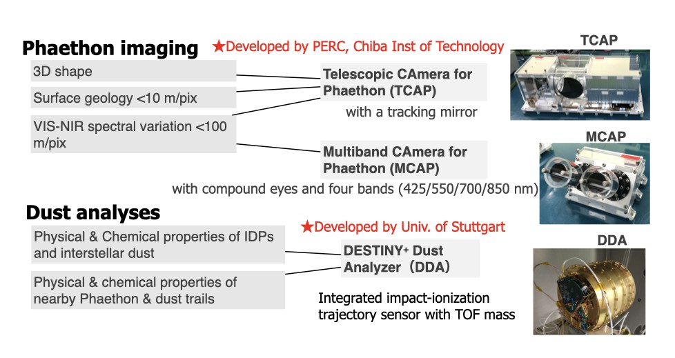 DESTINY+ will be equipped with three science instruments: the DESTINY+ Dust Analyzer (DDA), the Telescopic CAmera for Phaethon (TCAP), and the Multiband CAmera for Phaethon (MCAP). The DDA is a small, lightweight, high-performance model that is an improved version of the Cosmic Dust Analyzer (CDA) on board the Cassini spacecraft. It is being developed by a team from the University of Stuttgart in international collaboration with Germany. The development of TCAP and MCAP is being led by Chiba Institute of Technology (Fig.3).