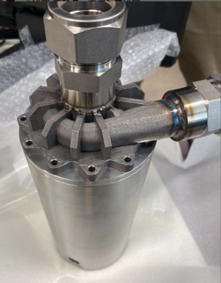 これは高速回転するインペラから旋回しながら吐出される推進剤を集め、一本の管に流すためのボリュート(渦巻室)と呼ばれる部品です。鋳物のように見えますが、アビストさんに金属3Dプリンタで製作して頂き、黒磯製作所さんに仕上げ加工と溶接をして頂きました。鋳造や機械加工では不可能な複雑な形状でも製造可能です。3Dプリンタ独特の制約条件もあるのですが、内部の流路形状を工夫することで解決しています。このポンプに10MPa(100気圧)をかける耐圧試験を実施する予定です。