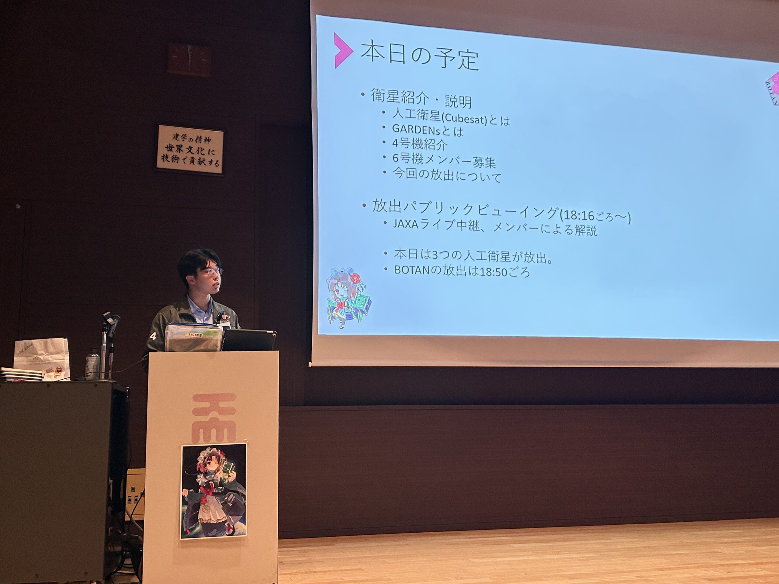 キューブサットは主にISSの「きぼう」日本実験棟のロボットアームから宇宙へ放たれます。その様子はライブ中継され、併せてオンライン配信イベントが行われます。衛星の紹介映像が流れたり、『Go /No Go call』という「衛星放出を決行か?中止か?」の最終確認のコールをしたり、最後に代表者が挨拶をしたり…つくば・JAXA組の4年生はそれをやりに行ったというワケです。