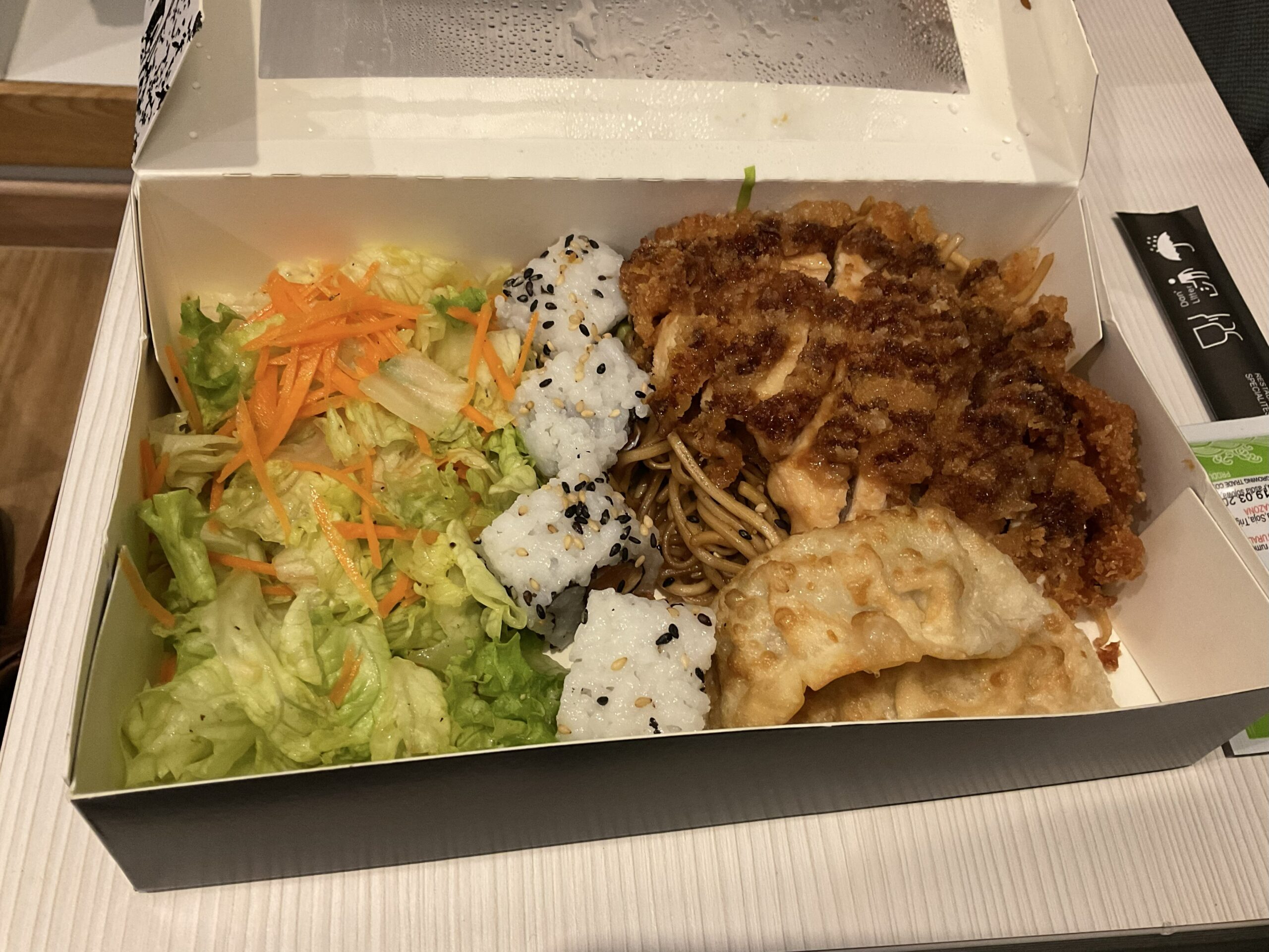 街でteriyaki bentoを頼んだら、チキンカツとギョーザと焼きそばと寿司のボックスが来ました。味は良し。
