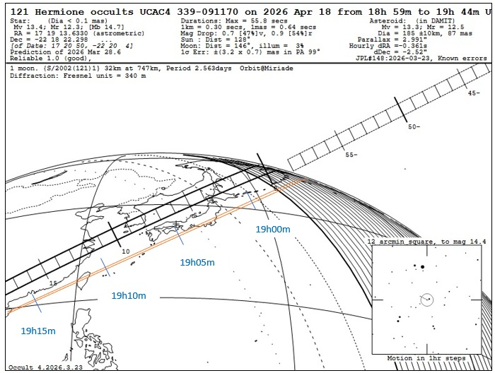 | 04/18 19h05m | UCAC4 339-091170 | 13.4 | 17 19 13.633 | -22 18 22.29 | (121)Hermione | 13.3 | main body 196 satellite 32 | main body 59.0 satellite 9.6 | 0.7 | Japan, Korea, SE China | HayatoWatanabe | Binary |