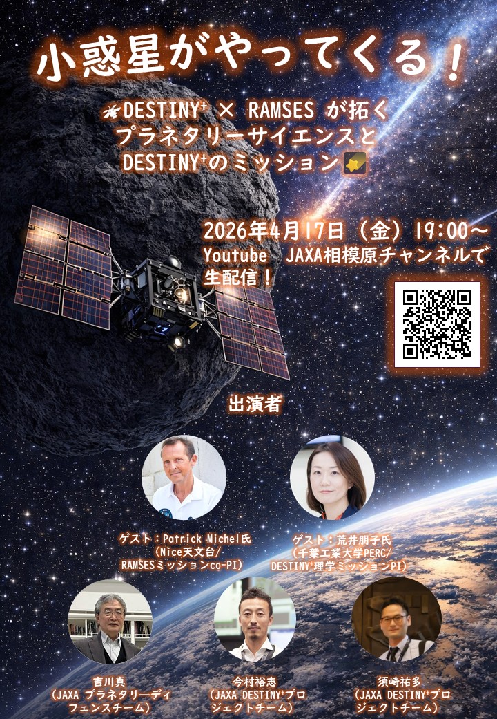 来る小惑星の接近に向けて、プラネタリーディフェンスについて、また、『DESTINY⁺』とESA『RAMSES』のサイエンス、『DESTINY⁺』の最新の開発状況、そしてフライバイを支える姿勢制御技術について、❝最前線の挑戦❞を続ける研究者たちが集い、YouTube[JAXA相模原チャンネル]で生配信!